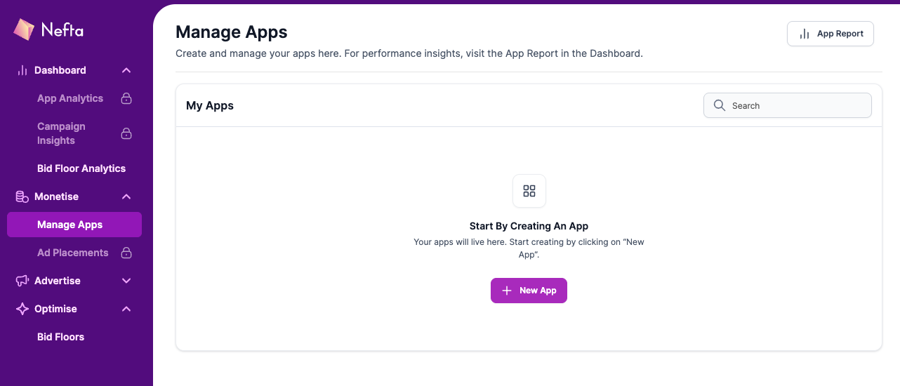 Once you're set up, go to the Manage Apps section under Monetise and create your app.