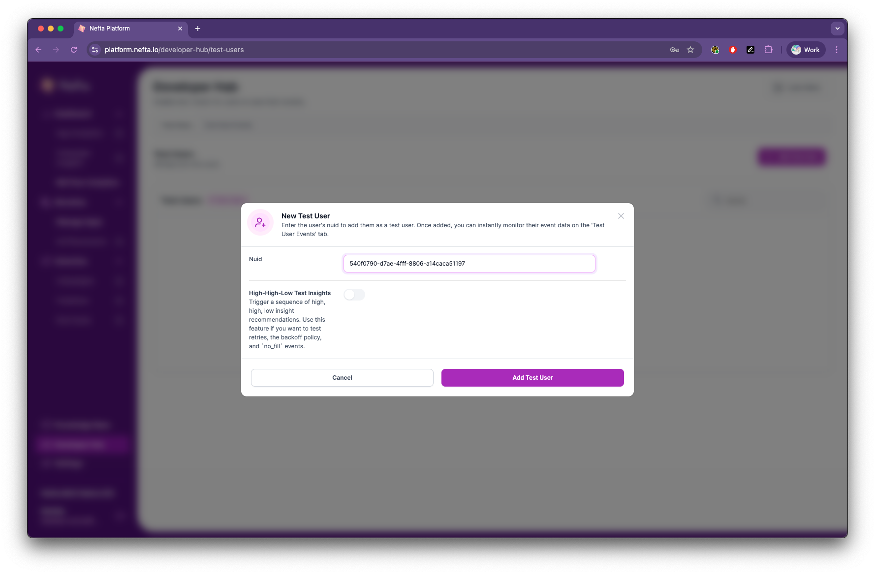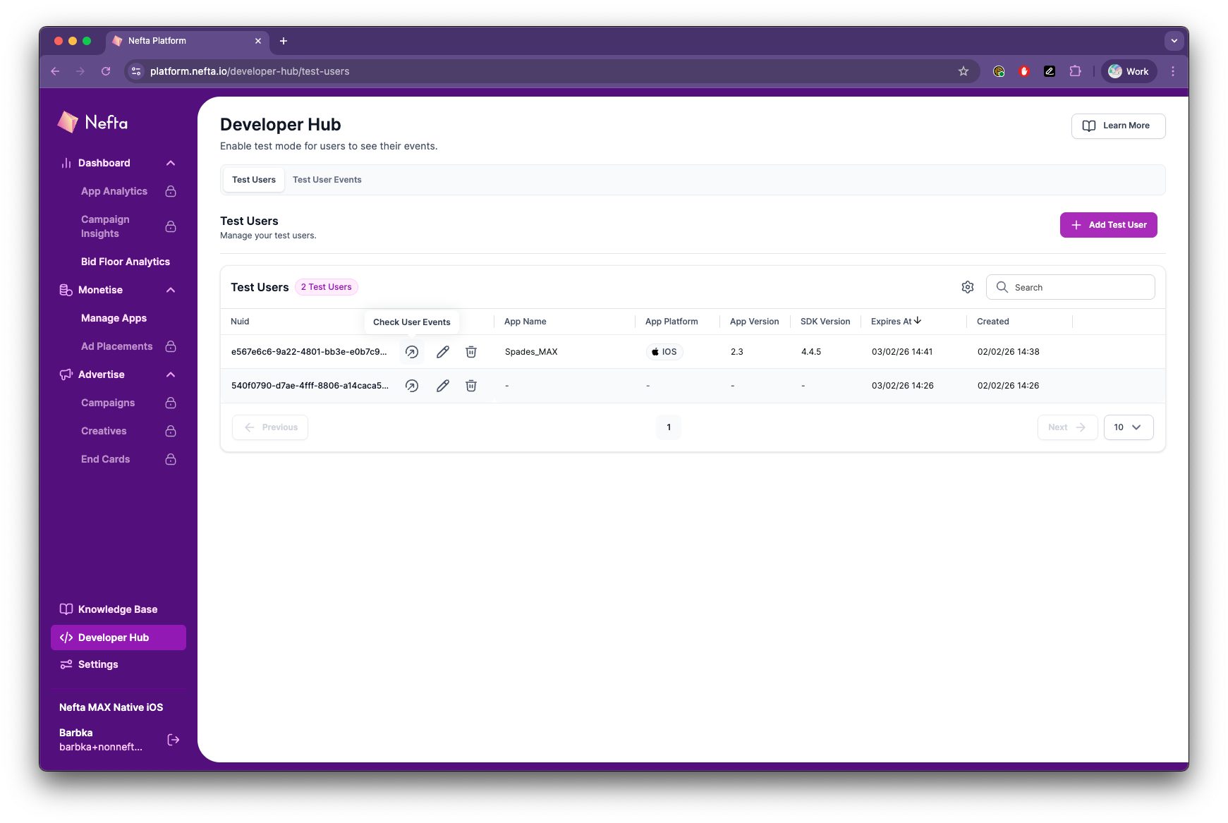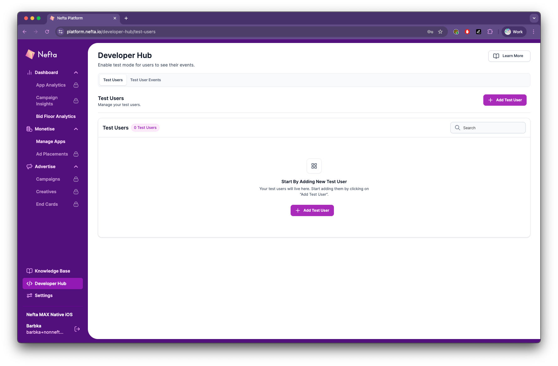 When testing the Nefta integration it is often useful to test a specific functionality only on a selected device to avoid disrupting production users. Check out the Test Users tab, on the dashboard to create a test user for your device.
