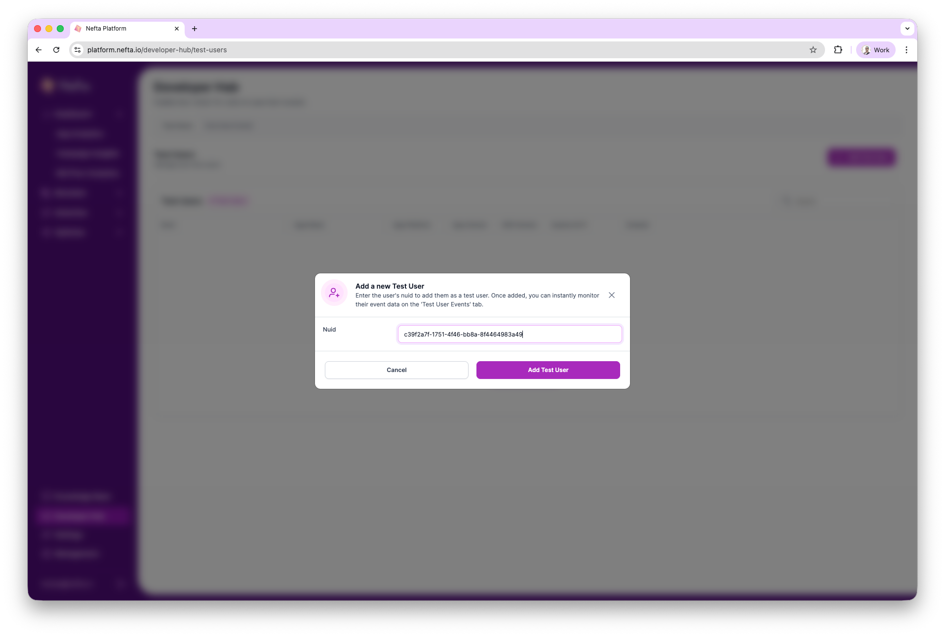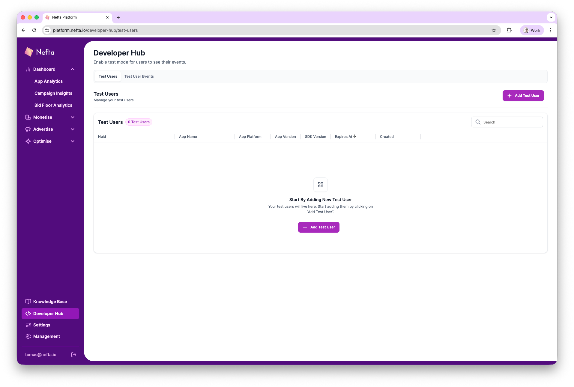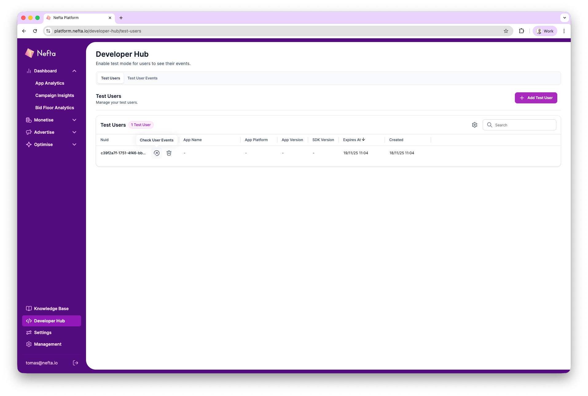 When testing the Nefta integration it is often useful to test a specific functionality only on a selected device to avoid disrupting production users. Check out the Test Users tab, on the dashboard to create a test user for your device.