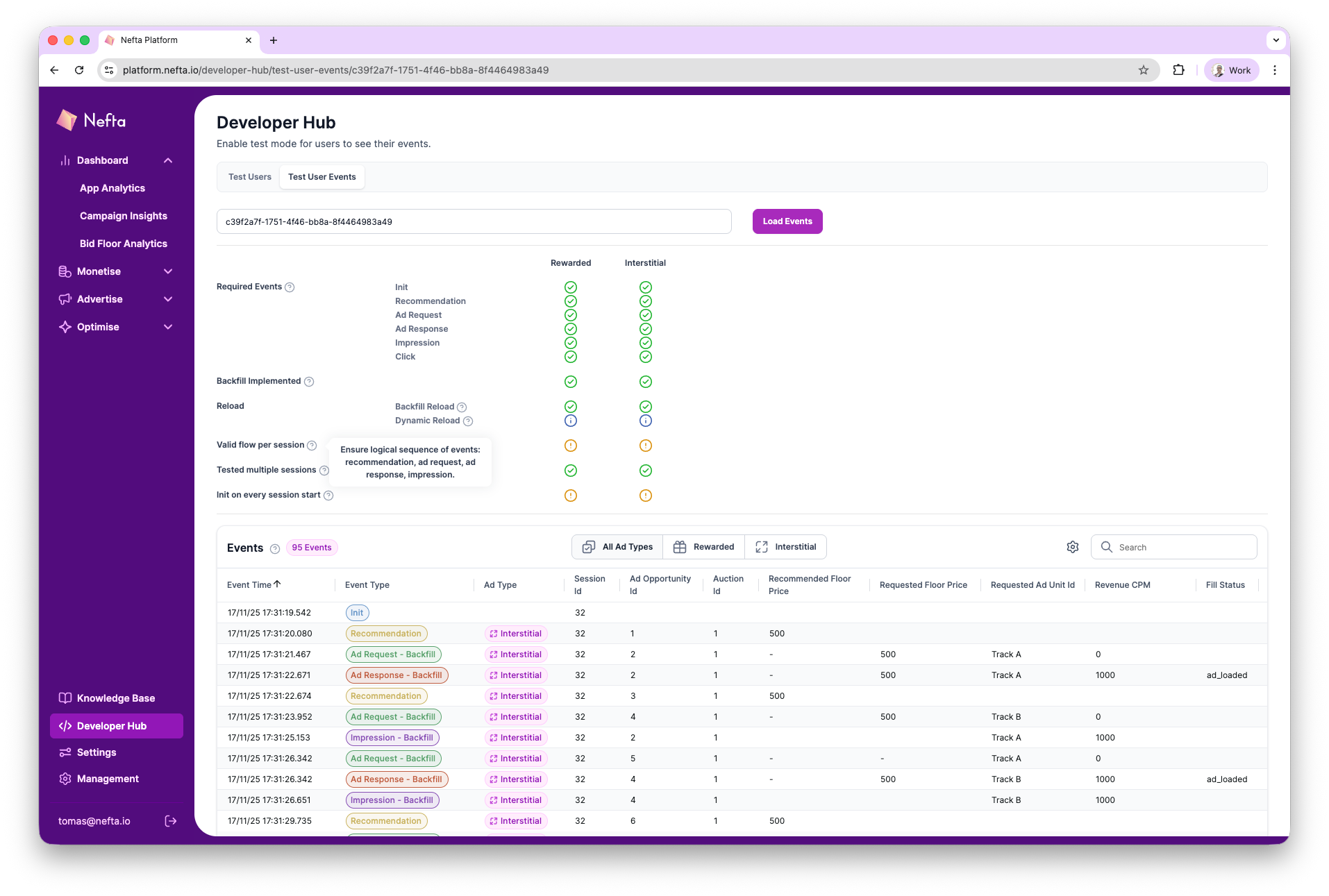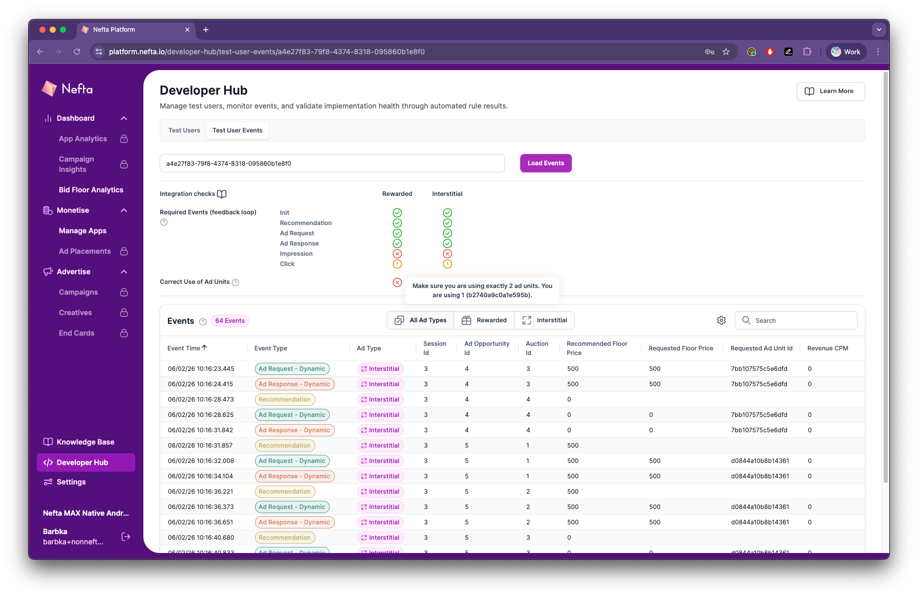 The Developer Hub Dashboard allows external developers to view detailed backend event flows for a specific Nefta identifier (nuid) and ad type.